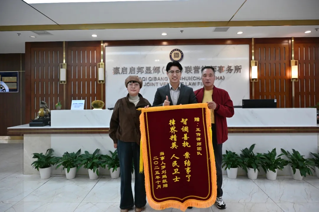 “10万元案款本息全部到位了!感谢王传律师的完美诉讼策略,高超的谈判水平和智慧调解技巧有力促成案款全部到位。您是人民卫士是人民满意的好律师!”2025年11月7日,委托人罗某的父母将一面印有“智调善执、案结事了,律界精英、人民卫士”字样的锦旗送到湖南瀛启律师事务所王传律师手中。