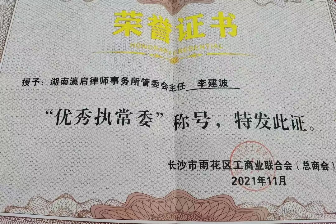 2022年7月6日,湖南瀛启律师事务所管委会主任李建波律师出席雨花区工商联(总商会)六届二次会员大会暨2021年度总结表彰大会,并被雨花区工商联(总商会)授予“优秀执常委”称号。