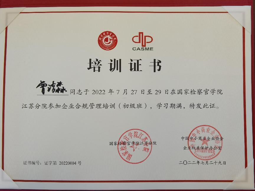 2022年7月27日,我所代表曾洁淼律师参加了由中国中小商业企业协会联合国家检察官学院在江苏句容举办的“第一期企业合规管理培训班”。