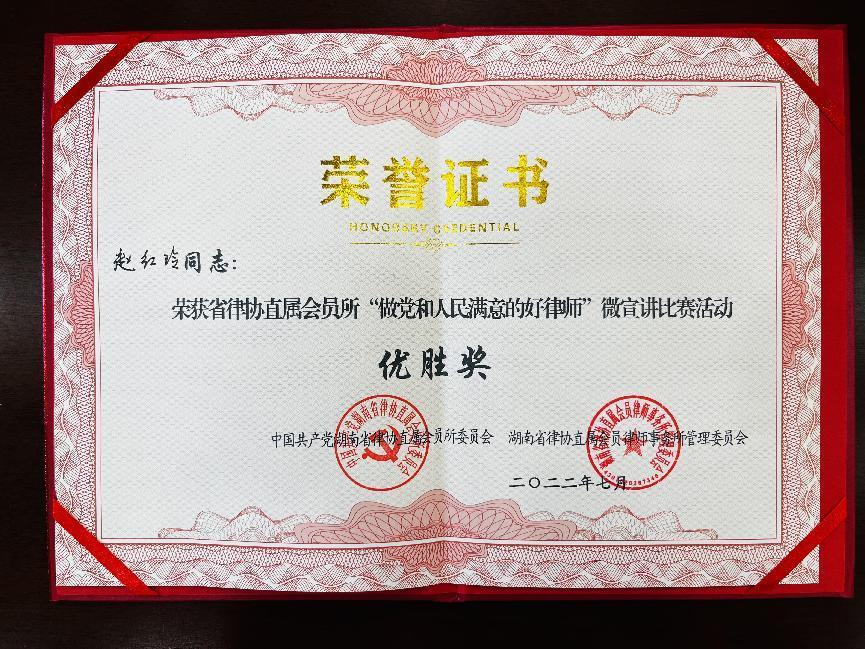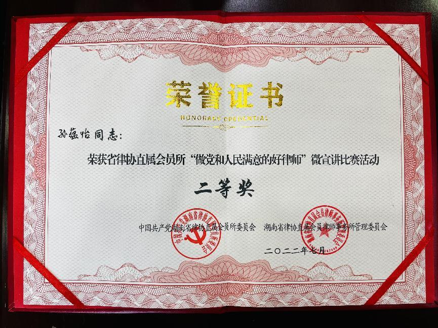 据悉,本次比赛共有16家省直会员所派出了22名律师参加,比赛共设一等奖1名,二等奖2名,三等奖3名,优胜奖6名。孙蕴怡律师宣讲主题为《一心向党,满怀人民》,她以娓娓道来,落落大方的宣讲形式打动了评委和现场观众,赢得全场热烈掌声,荣获二等奖。赵红玲律师宣讲主题为《走进百姓、幸福万家》,荣获优胜奖。
