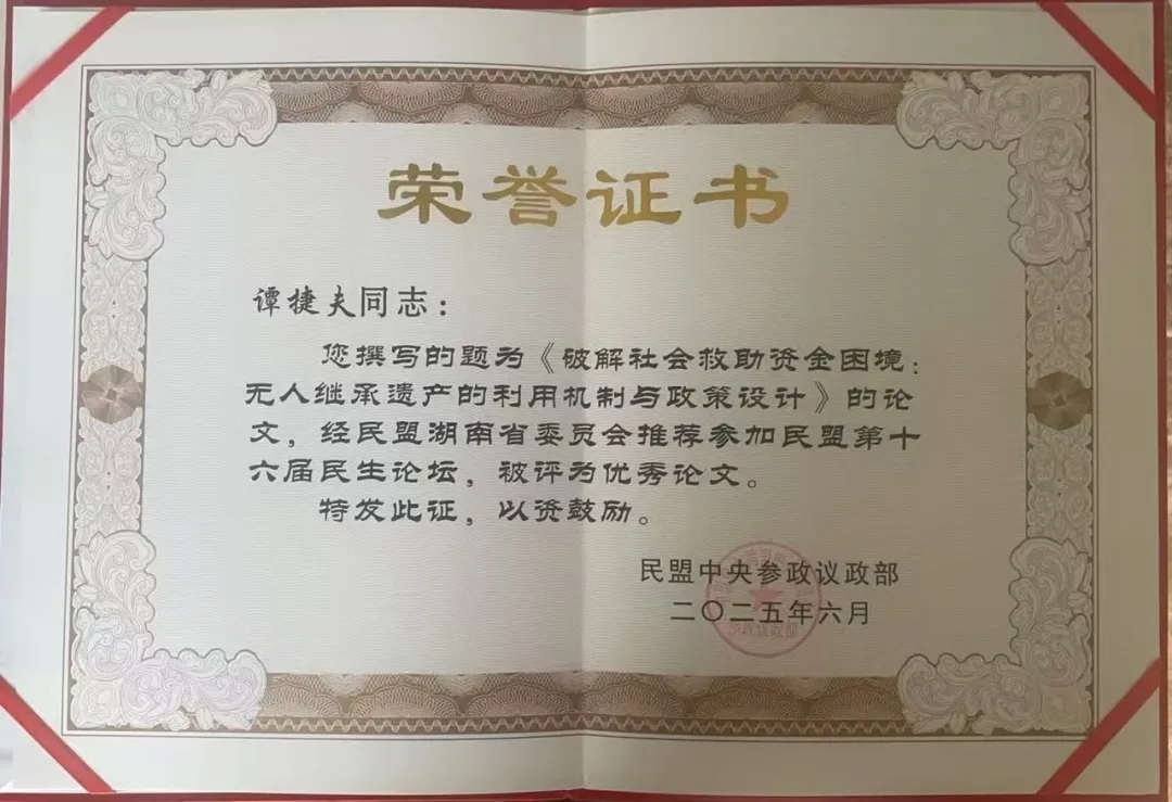 近日,民盟中央公布了第十六届民生论坛优秀论文表彰决定,我所谭捷夫律师撰写的《破解社会救助资金困境:无人继承遗产的利用机制与政策设计》脱颖而出,获评优秀论文。这一荣誉的获得,彰显了瀛启律师在专业领域深耕的同时,积极为社会民生事业建言献策的责任担当。
