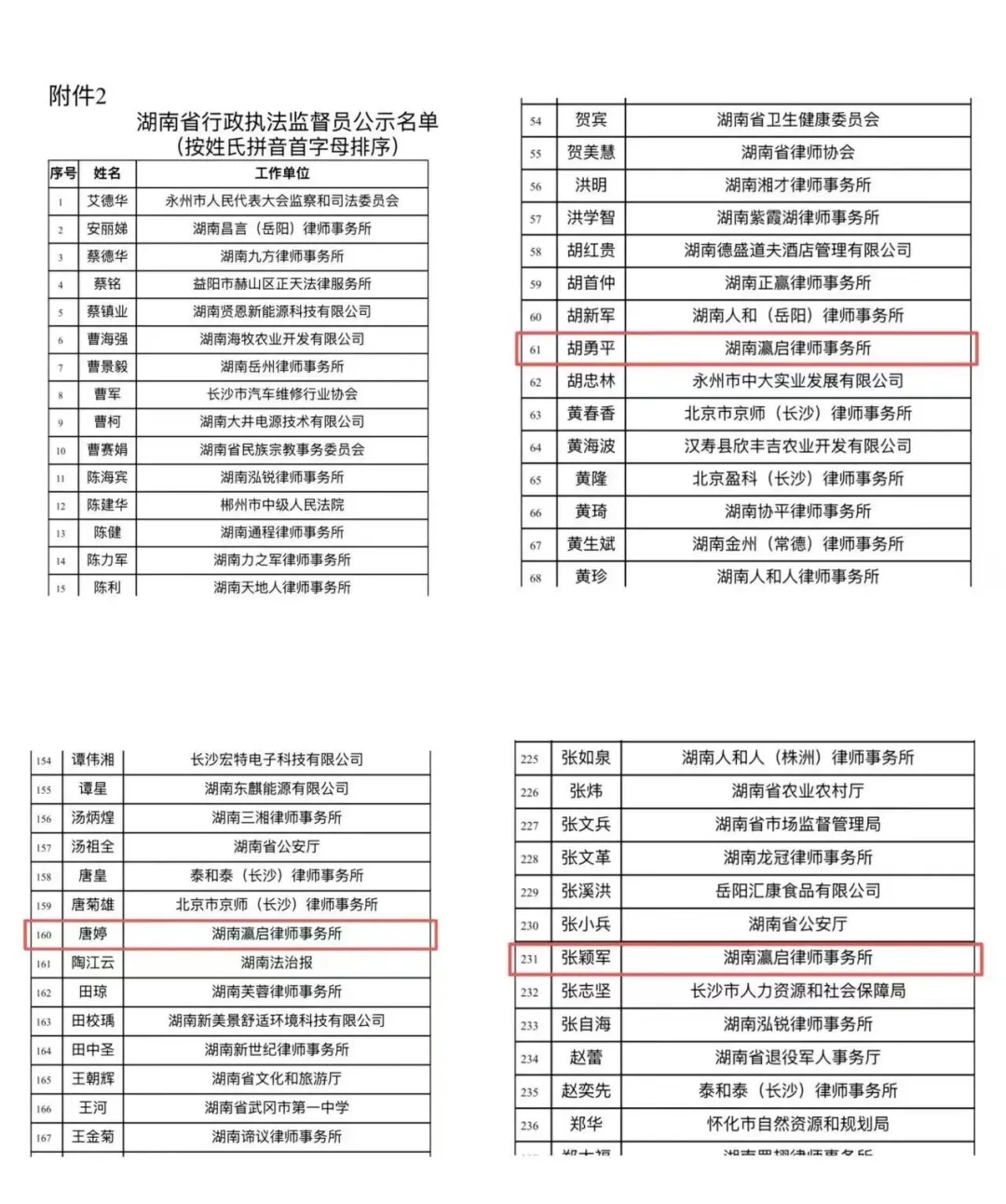 9月19日,湖南省人民政府行政执法协调监督局发布《关于选任行政执法监督员和设立行政执法监督联系点的公示》,为进一步推进严格规范公正文明执法,优化法治化营商环境,充分发挥社会力量在行政执法监督中的积极作用,经严格遴选,我所胡勇平律师、张颖军律师、唐婷律师获聘为湖南省行政执法监督员。