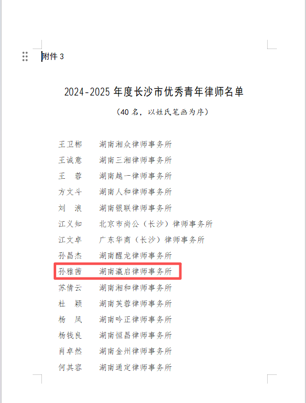 近日,长沙市律师协会评选相继公示,湖南瀛启律师事务所凭借卓越的专业实力、良好的行业口碑与突出的社会贡献,再度荣膺“长沙市优秀律师事务所”称号;律所青年骨干孙雅茜律师获评“长沙市优秀青年律师”,行政管理人员杨婕荣获“行政管理先进个人”表彰。三项荣誉的集中斩获,既是行业对瀛启律所综合实力的高度认可,更是对其团队建设、专业服务与行政保障全方位发展的充分肯定。